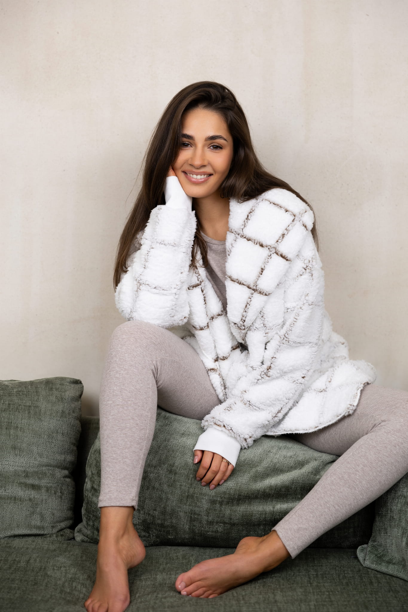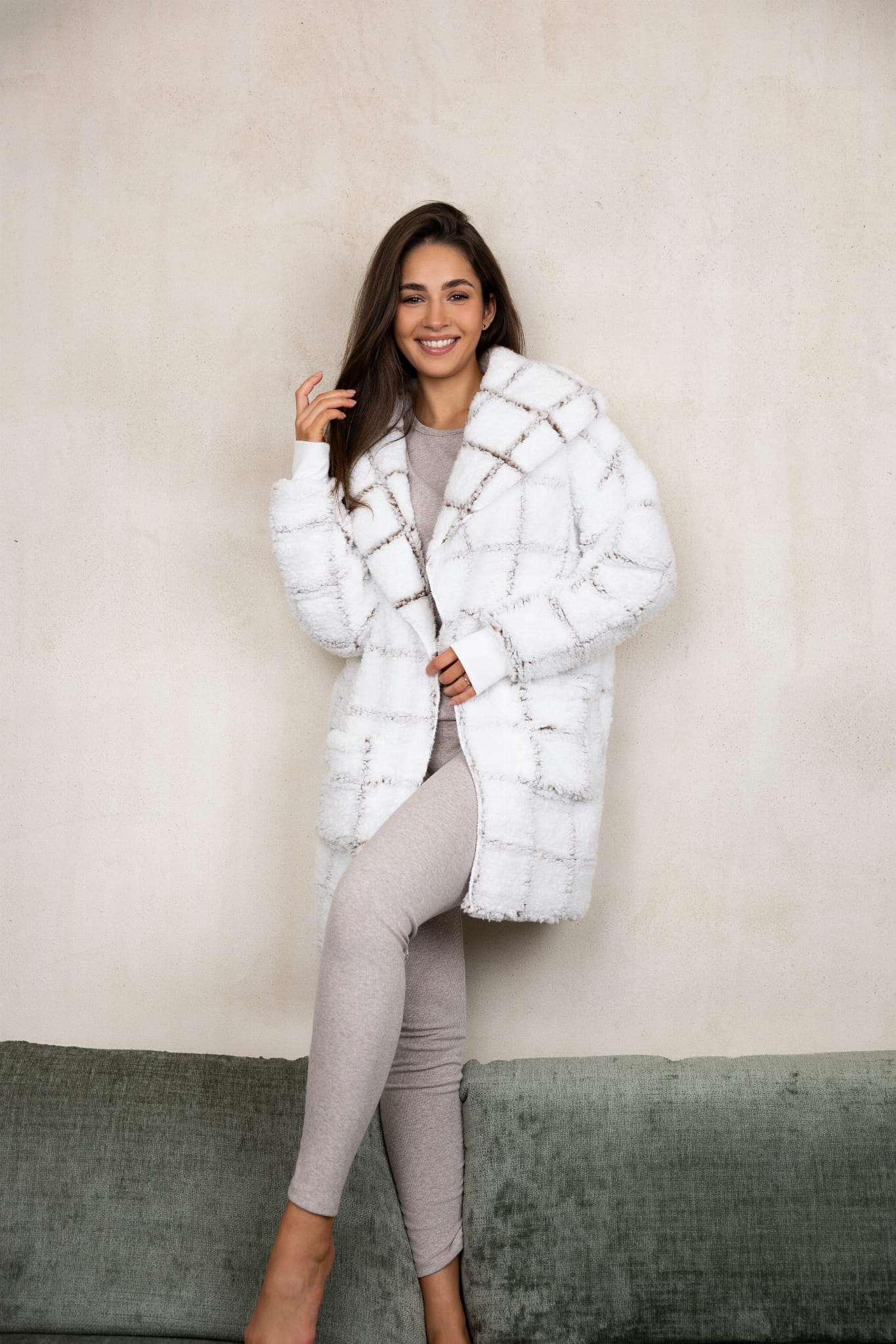 Miękki, przytulny kardigan z z efektownym wzorem w kratę, łączącym biel z delikatnymi ciemnymi linami. Kardigan o idealnym kroju, tworzy stylowy, ale jednocześnie komfortowy wybór na chłodniejsze wieczory i poranki.