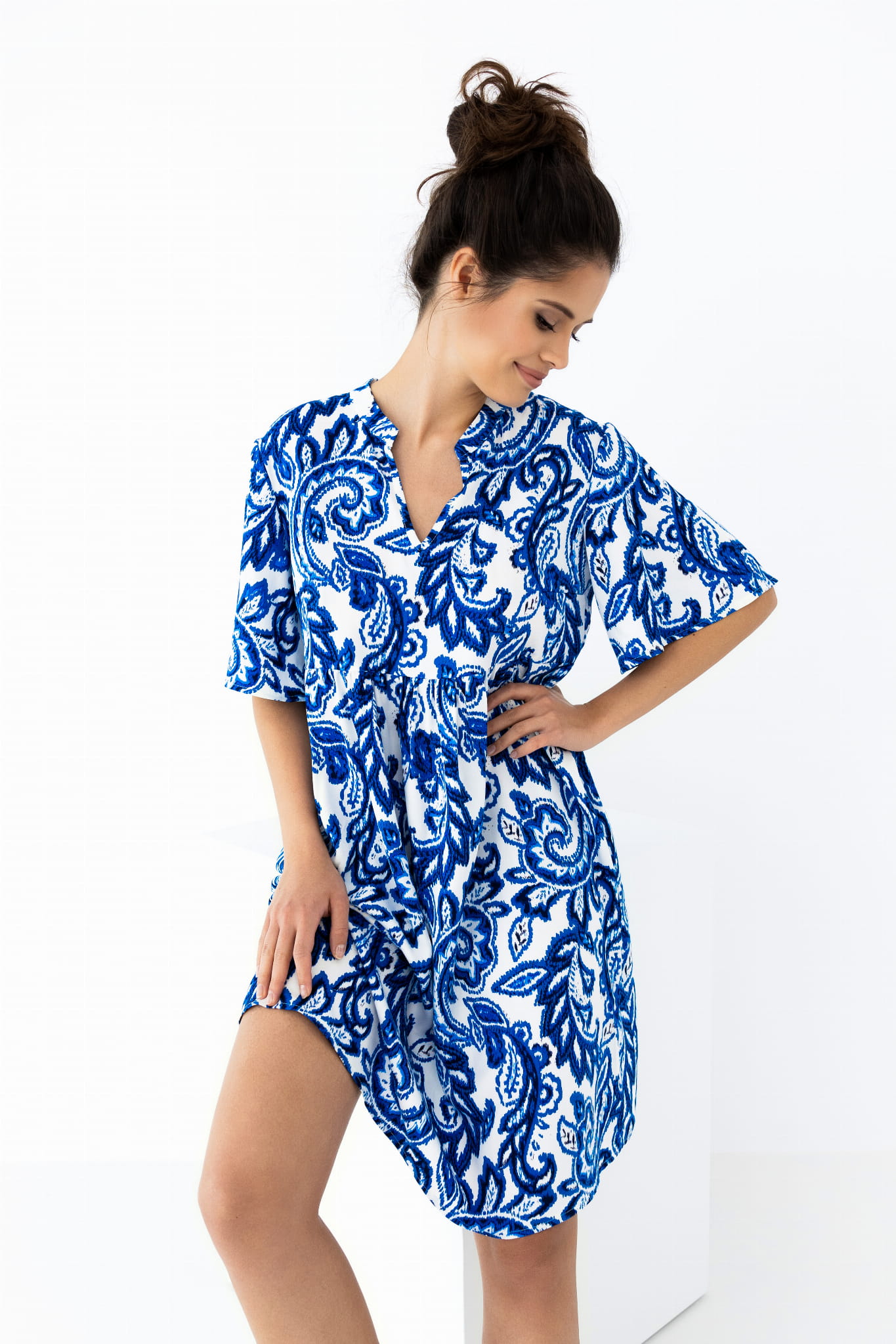 Koszula nocna LUNA to wygodna propozycja o luźnym kroju, wykonana z materiału w piękny, niebiesko-biały wzór. Krótki rękaw i długość sięgająca przed kolano sprawiają, że jest to komfortowy i elegancki wybór na każdą noc.