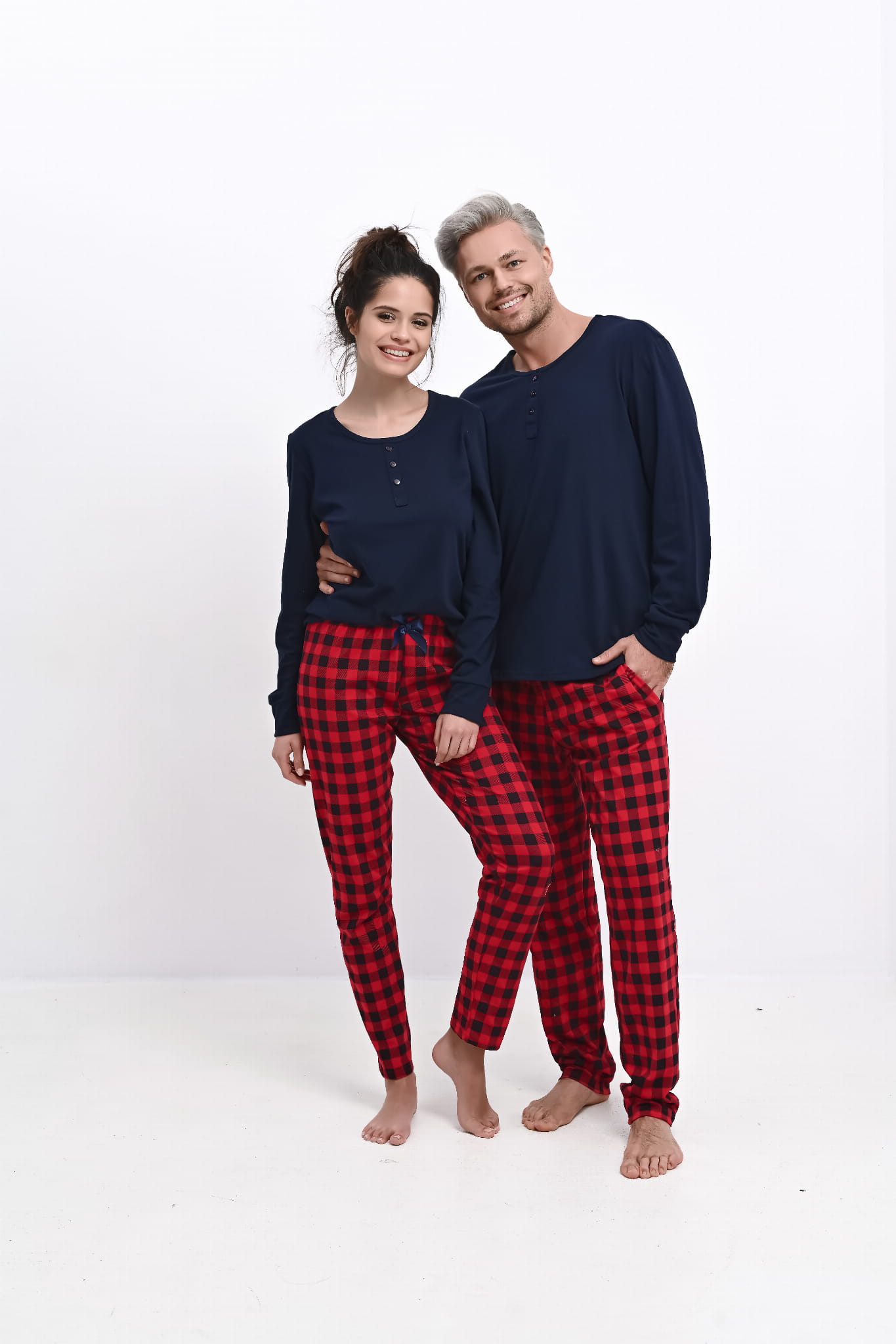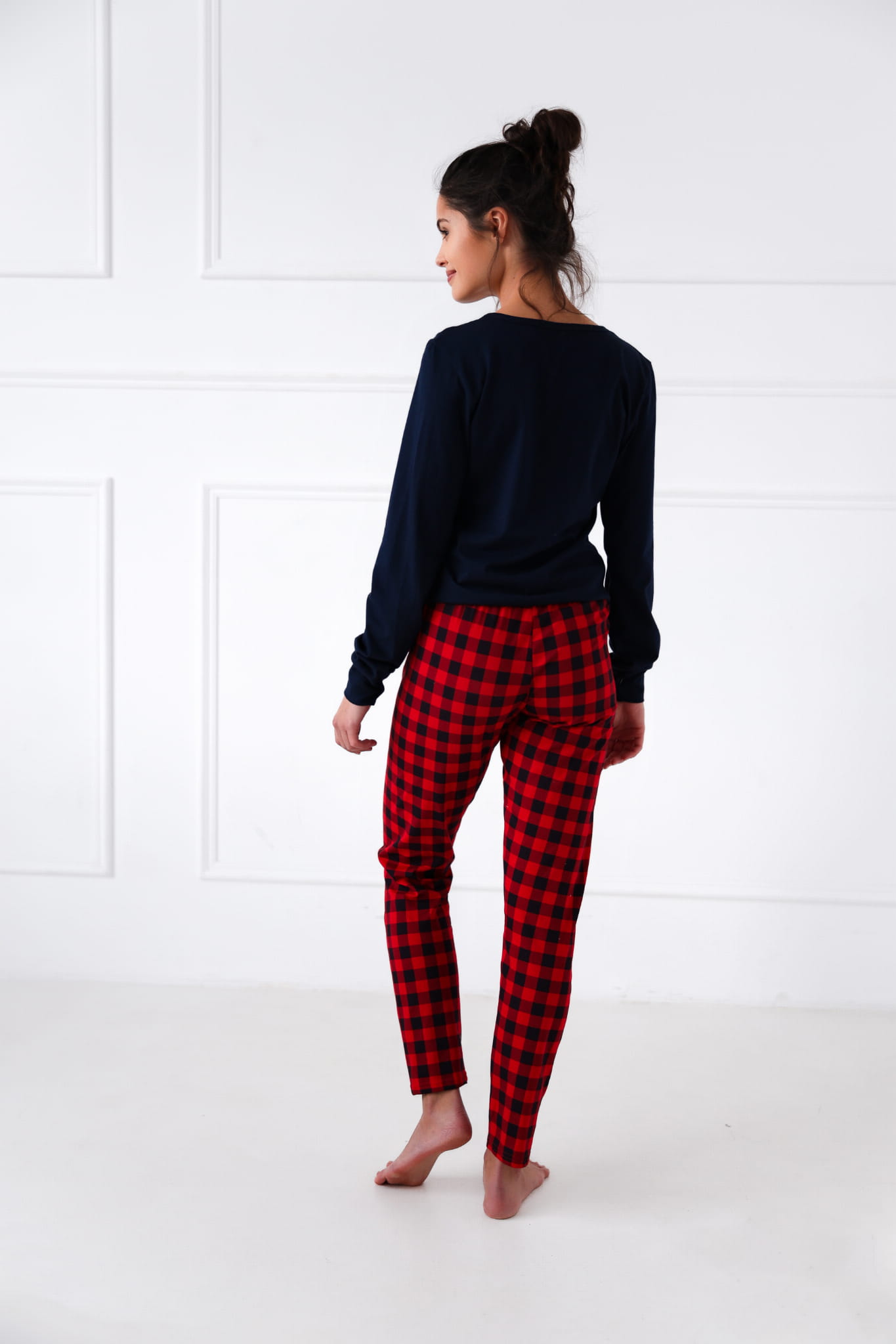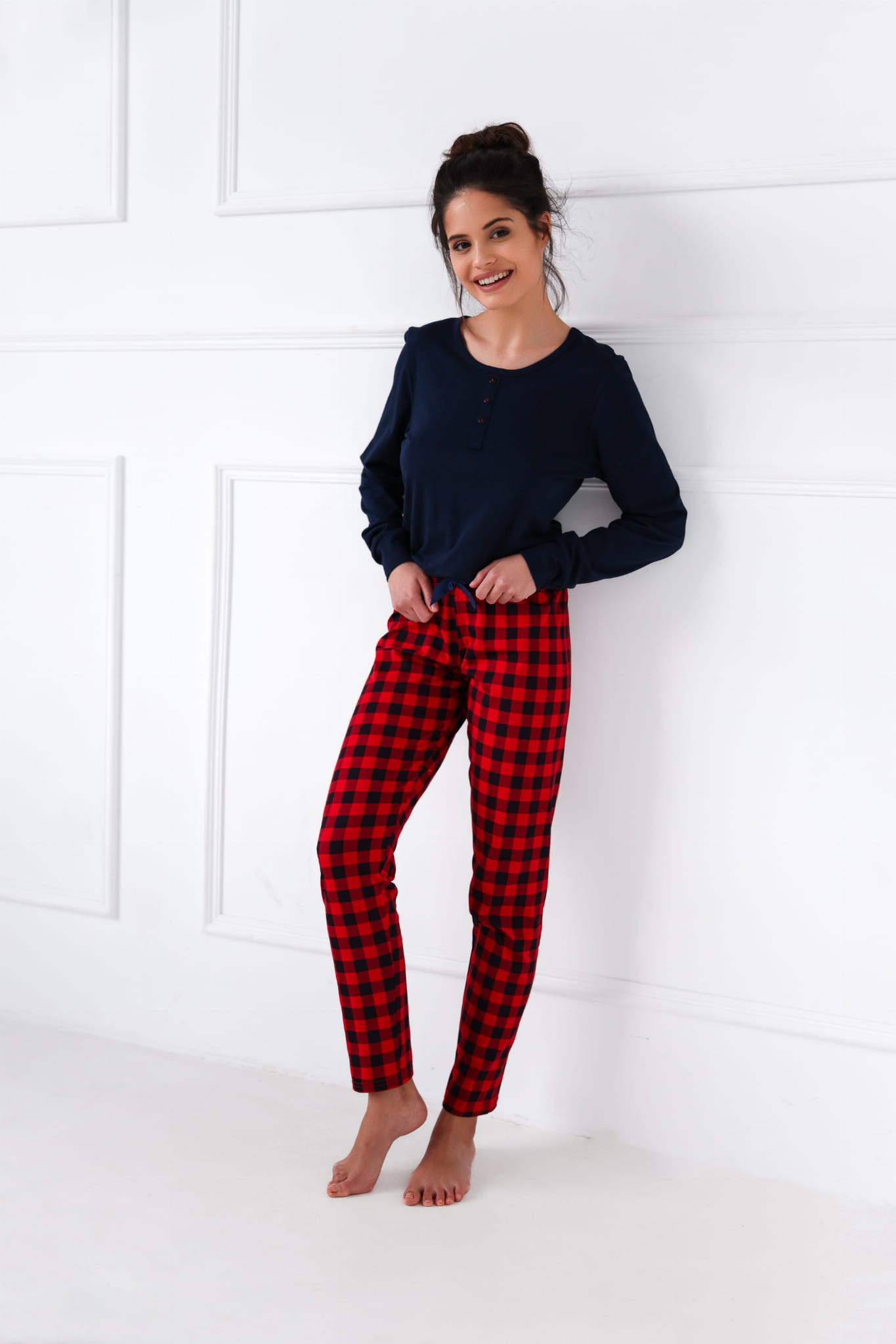 Damska piżama Bonnie wykonana z wysokiej jakości bawełny. Bluzka z długim rękawem, okrągły dekolt ozdobiony guzikami. Do kompletu długie spodnie, ozdobione w pasie satynową kokardką.