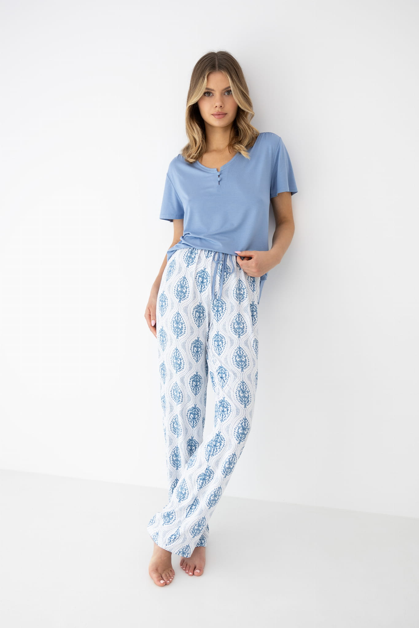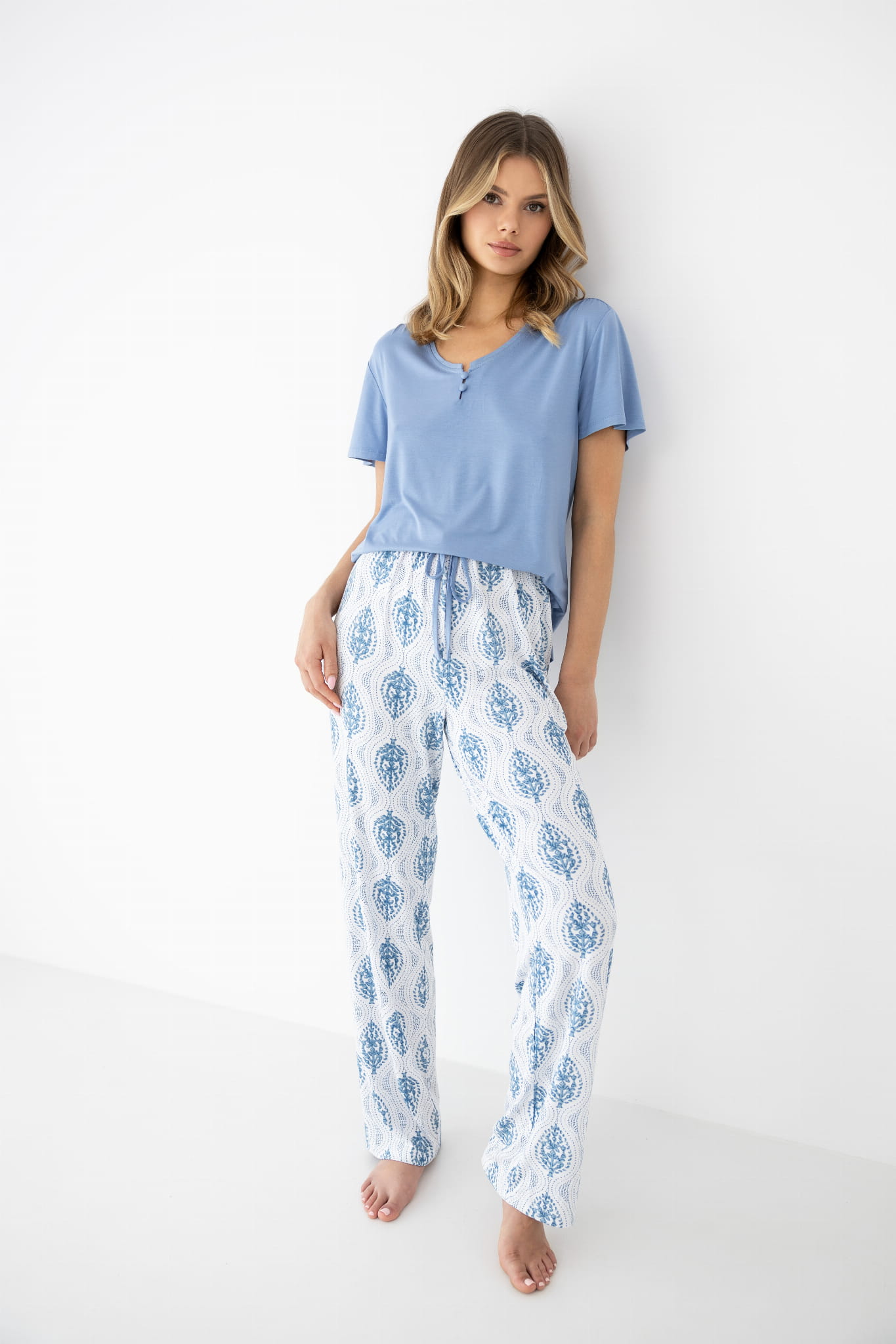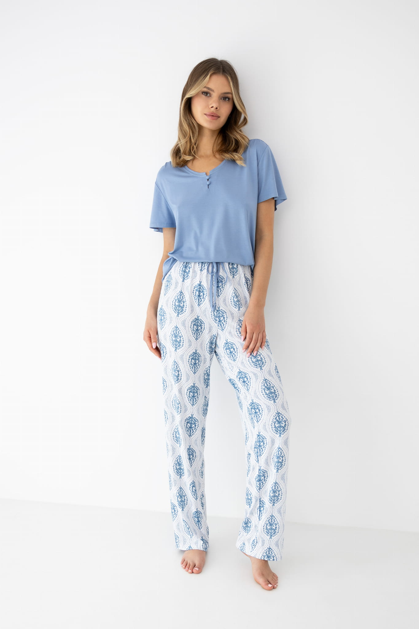 Długie spodnie z elastyczną talią zapewniają komfortowe dopasowanie oraz swobodę ruchów. Subtelny print dodaje lekkości i świeżości, tworząc spójną, stylową propozycję idealną zarówno na noc, jak i domowy relaks.