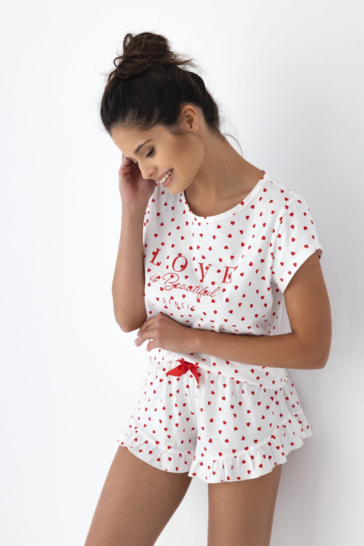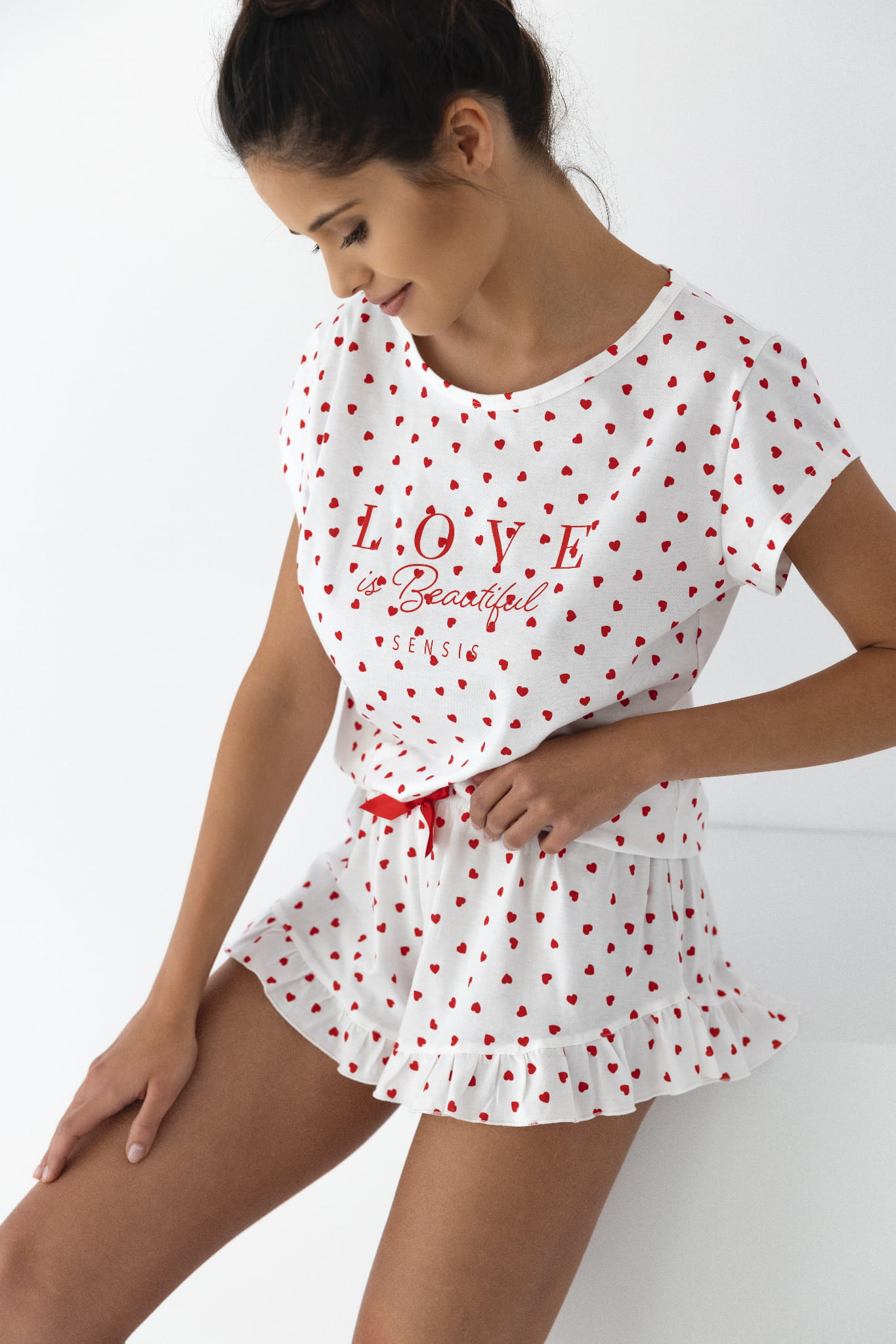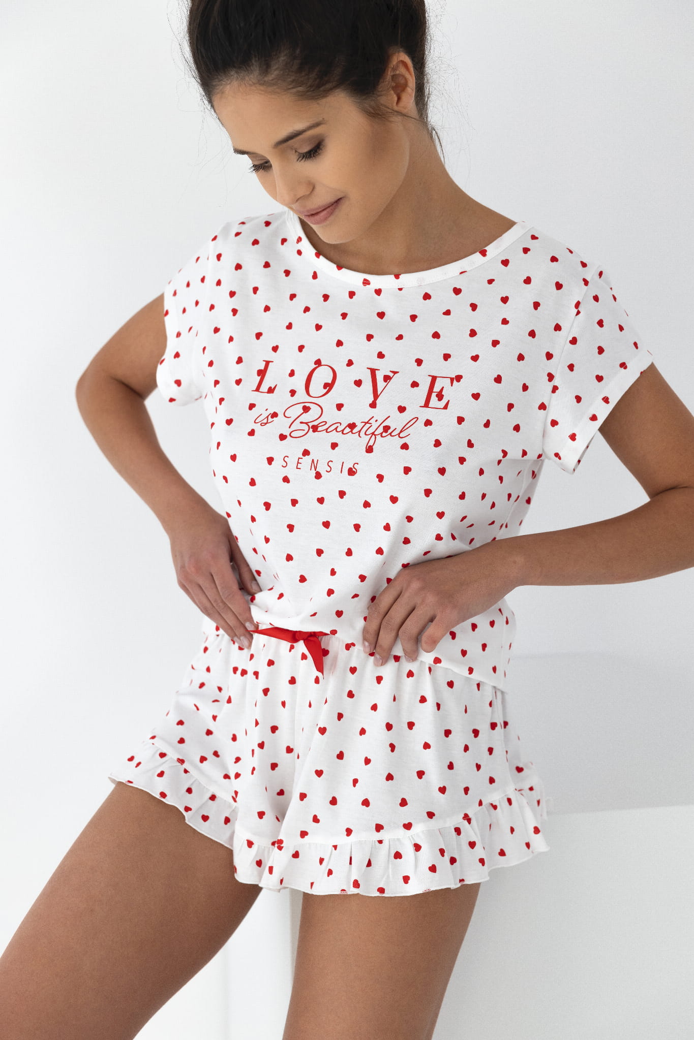 Damska piżama z przyjemnego materiału, zdobiona delikatnym nadrukiem w serca. Koszulka z krótkim rękawem i dopasowane szorty z falbanką tworzą spójny i komfortowy zestaw na każdą noc.