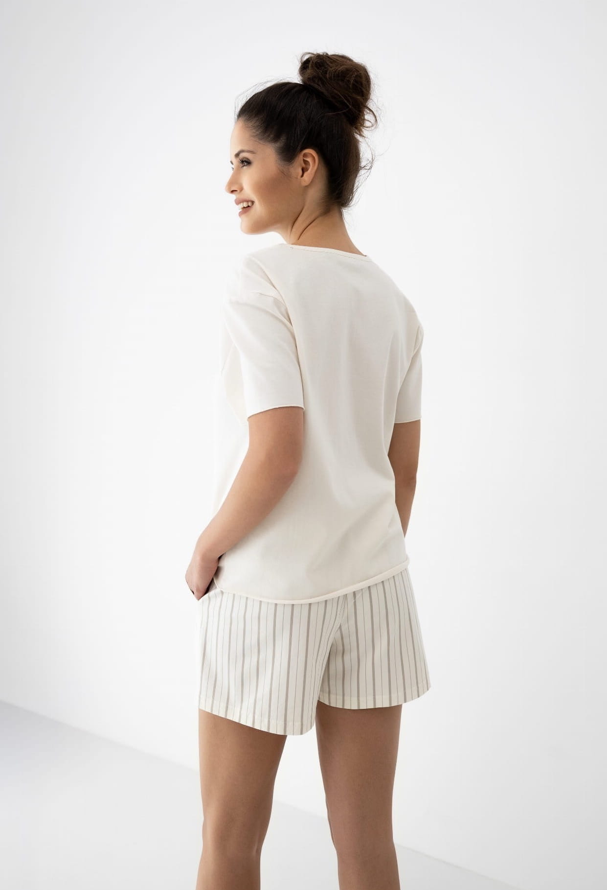 Piżama JEMMA to lekki, minimalistyczny zestaw składający się z gładkiej bluzki z krótkim rękawem oraz krótkich spodenek w delikatne pionowe paski. Prosty fason zapewnia swobodę noszenia i sprawdzi się zarówno podczas snu, jak i domowego wypoczynku.