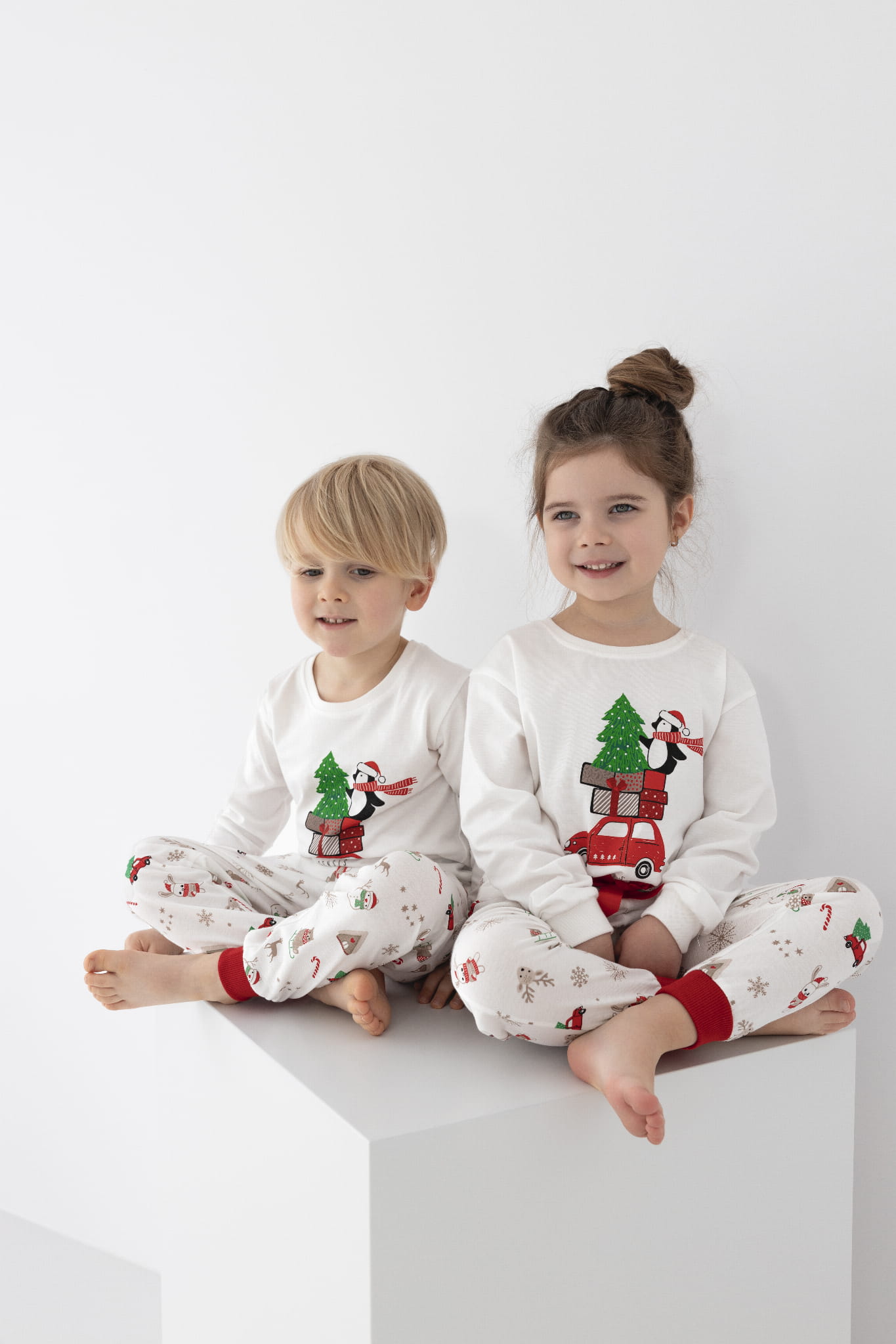 Dziecięca piżama wykonana z miękkiej bawełny. Bluzka z długim rękawem, ozdobiona delikatnym nadrukiem oraz wykończona ściągaczami. Do kompletu długie proste spodnie, ozdobione subtelnym świątecznym wzorem oraz satynową kokardką. Całość tworzy spójny, wygodny i stylowy zestaw.