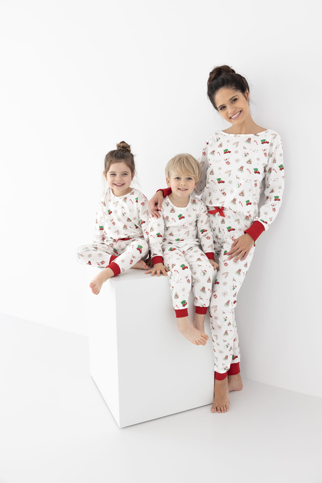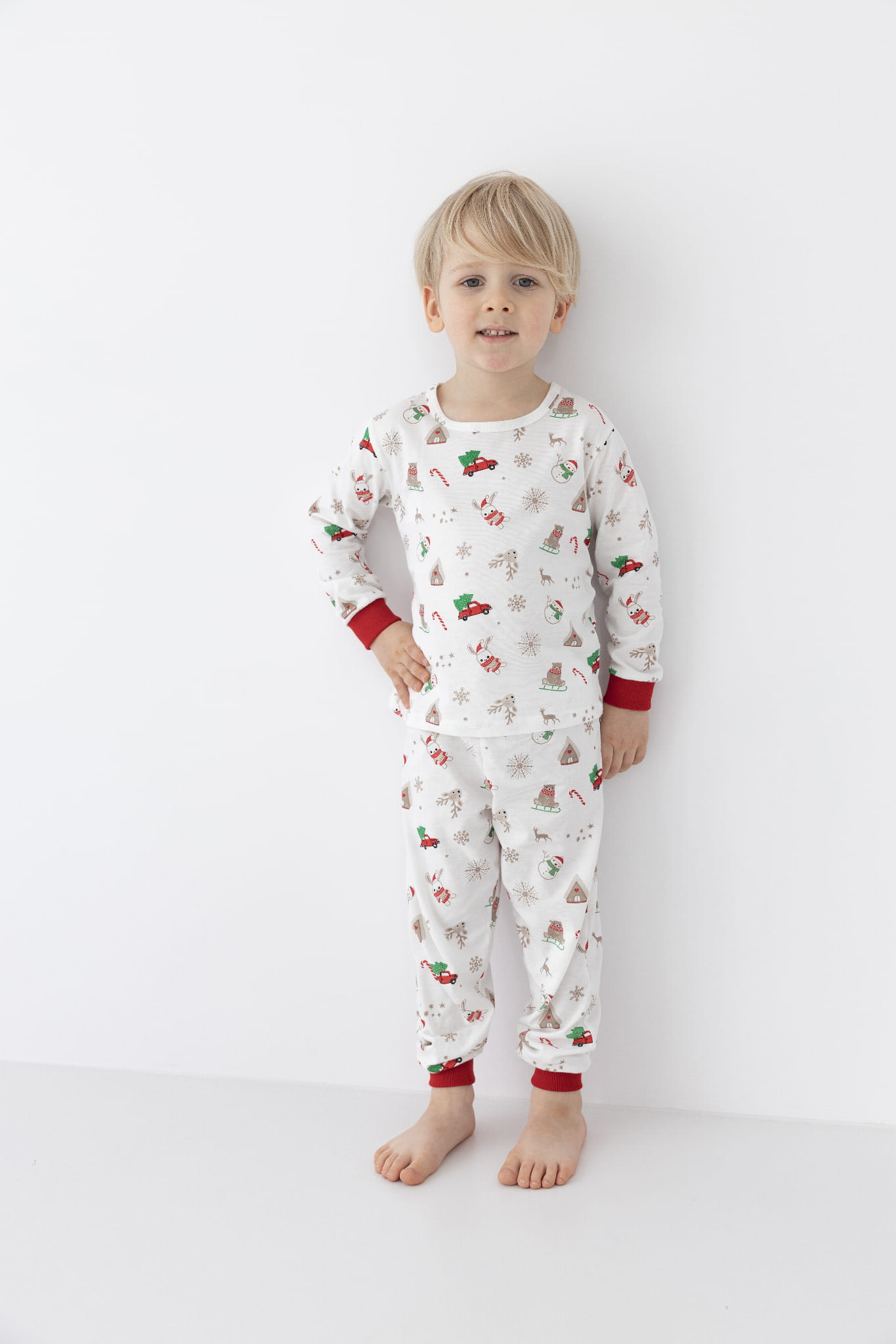 Damska piżama ozdobiona subtelnym świątecznym wzorem, wykonana z miękkiej bawełny. Bluzka z długim rękawem, wykończona ściągaczami, do kompletu długie proste spodnie, również wykończone ściągaczami. Całość tworzy spójny, wygodny i stylowy zestaw.