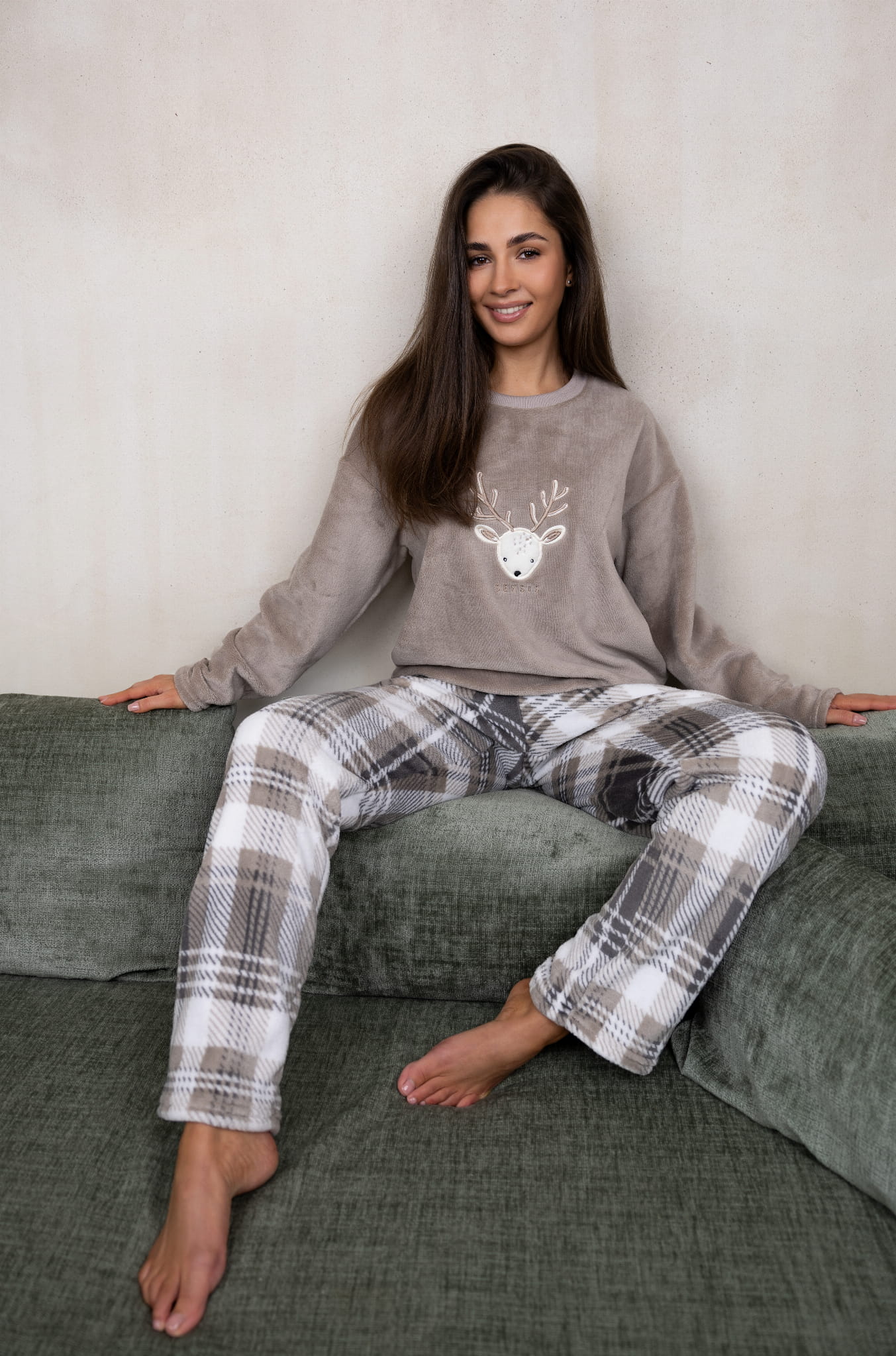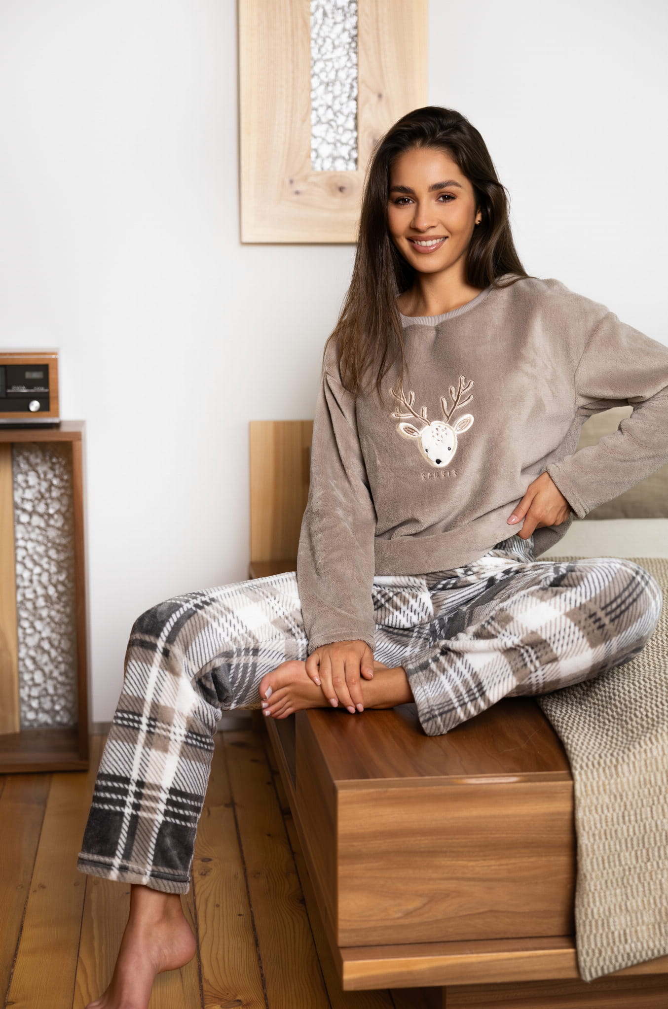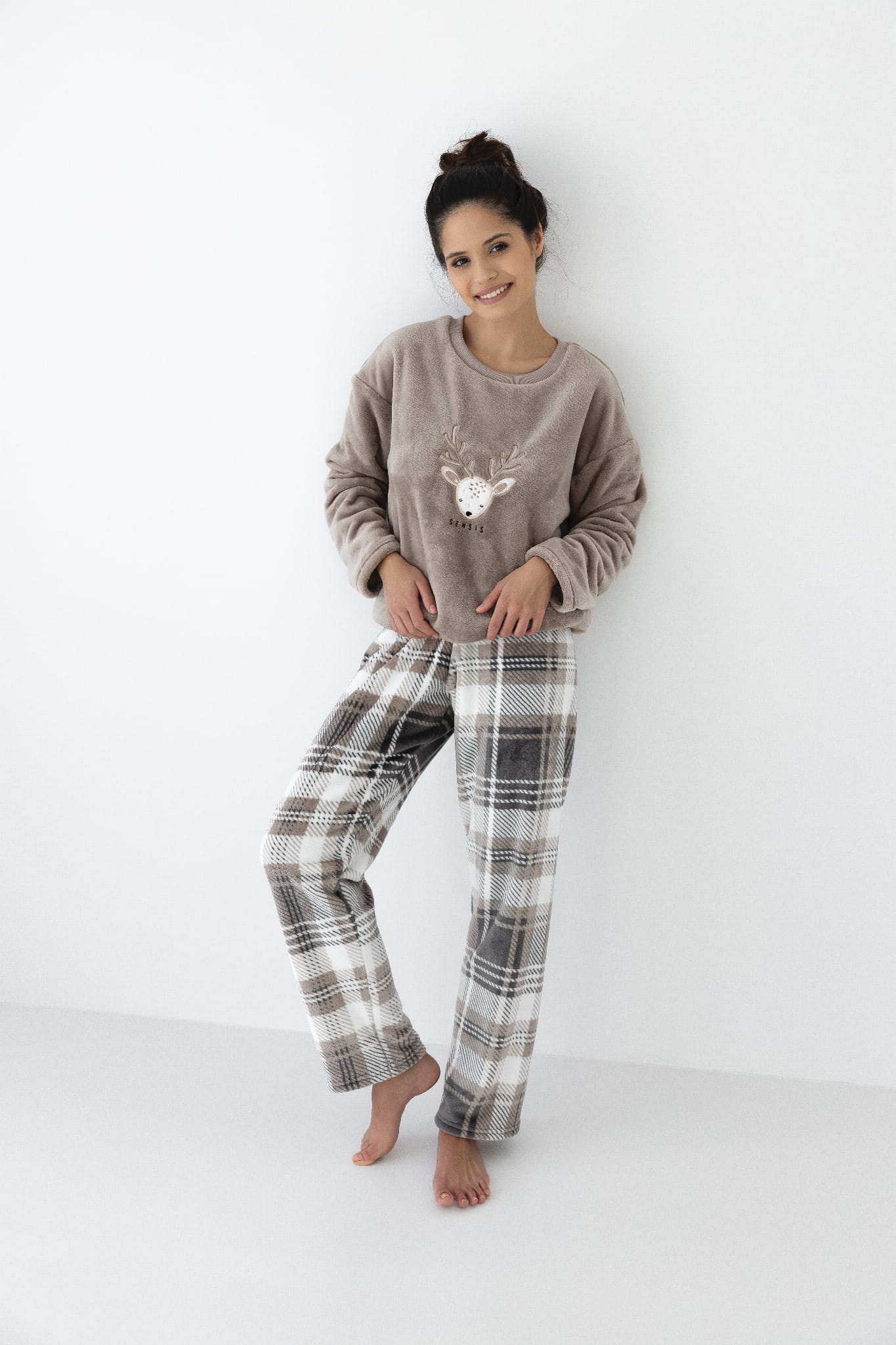 Ciepła i przytulna piżama MILOU to doskonały wybór na chłodniejsze wieczory. Bluza w kolorze jasnego brązu, ozdobiona subtelnym nadrukiem na przodzie. Długie spodnie w delikatną kratę dopełniają całość, tworząc stylowy i komfortowy zestaw.