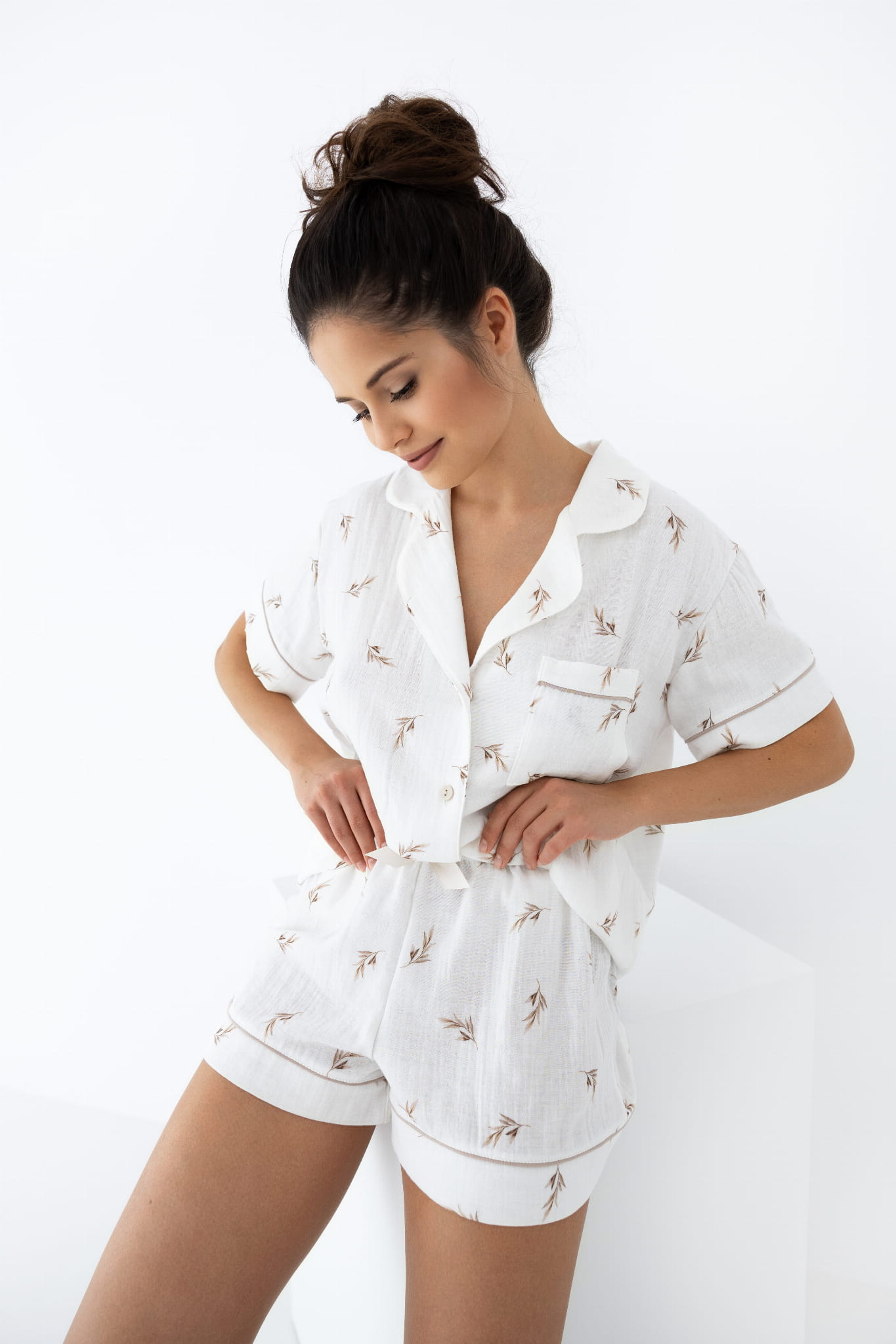 Piżama NASTIA to stylowy komplet składający się z koszuli z krótkim rękawem zapinanej na guziki oraz krótkich szortów. Jasny materiał z subtelnym wzorem nadaje całości świeżości i lekkości. Przyjemna w dotyku tkanina zapewniają maksymalny komfort podczas snu.