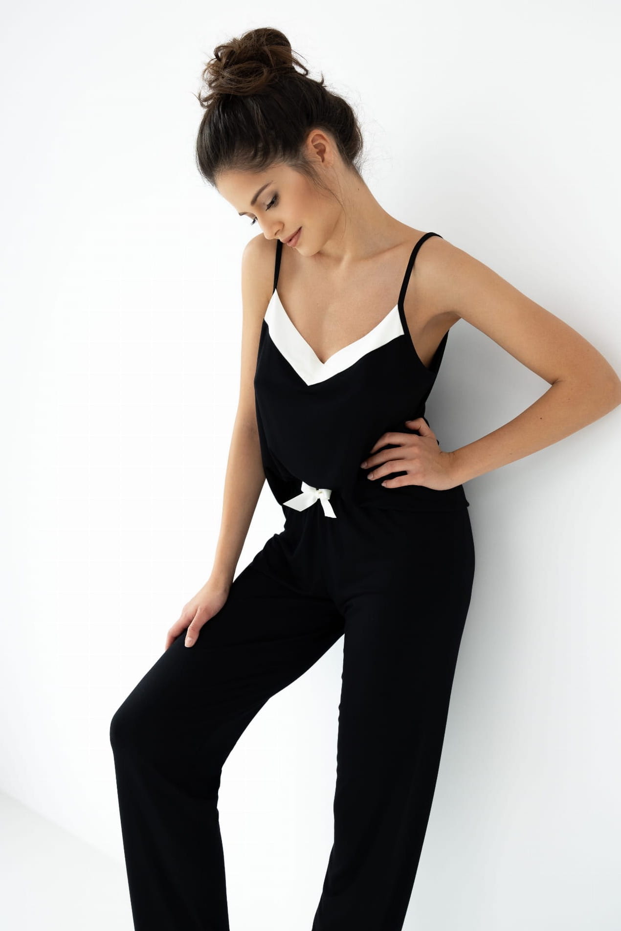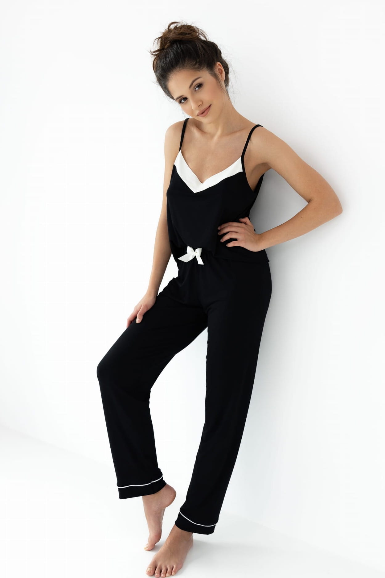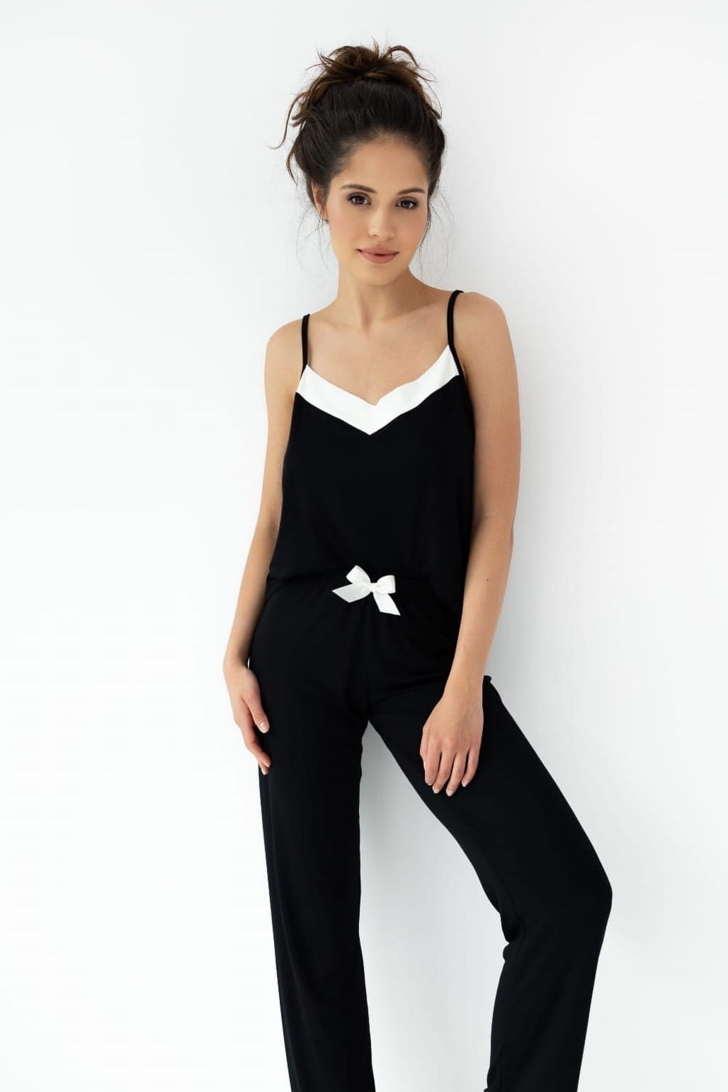 Stylowa piżama NIKITA to klasyczny zestaw składający się z topu na cienkich ramiączkach oraz długich spodni. Czarna tkanina została uzupełniona białymi detalami w okolicy dekoltu i kokardką w talii, co podkreśla jej elegancki charakter. Spodnie z subtelnymi lamówkami na nogawkach dodają szyku i wygody, czyniąc tę piżamę doskonałym wyborem na każdą noc.