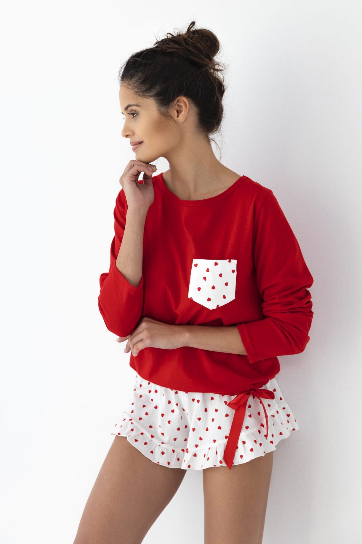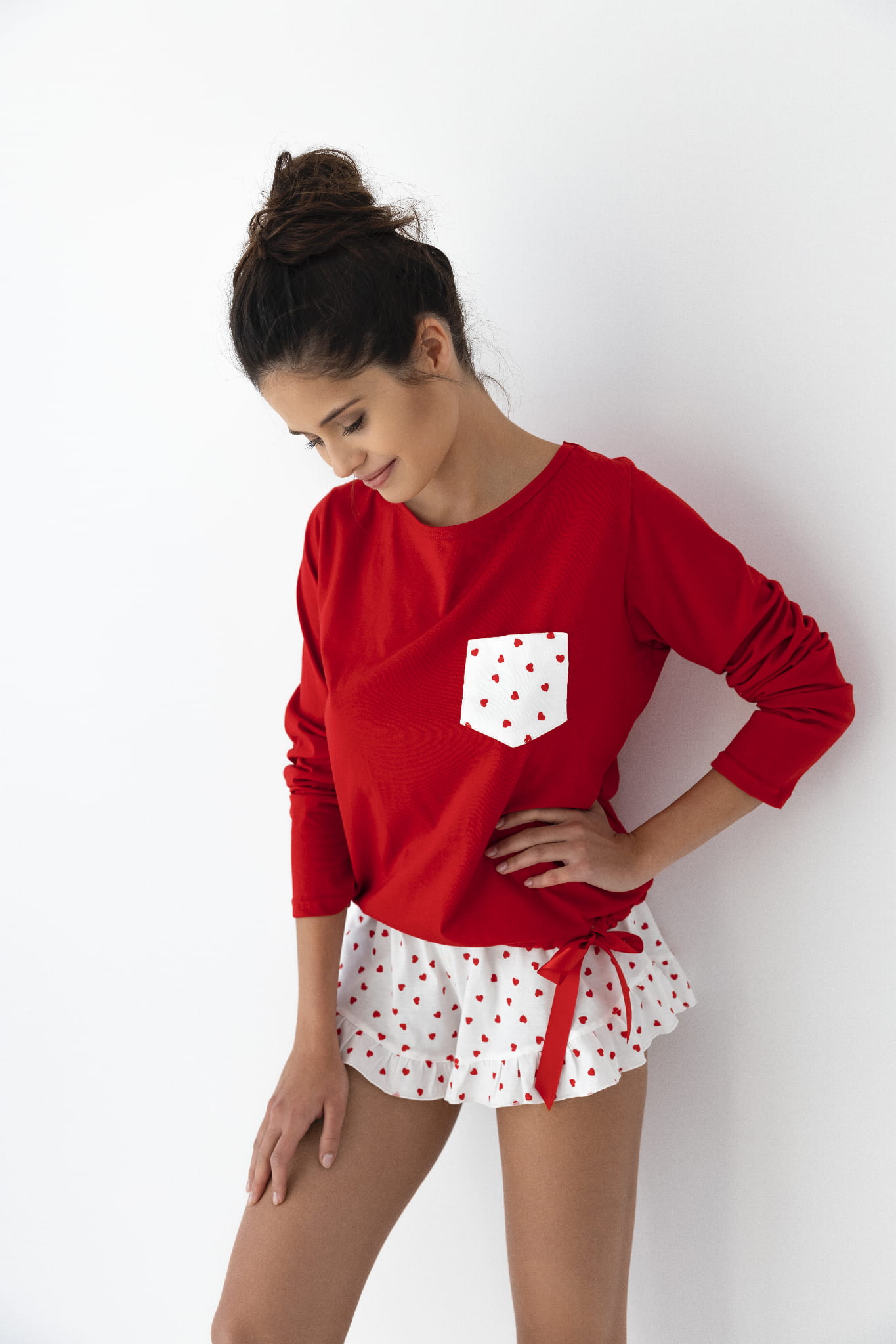 Damska piżama wykonana z przyjemnego materiału, koszulka z rękawem 3/4 oraz ozdobiona kieszonką z subtelnym wzorem i satynową wstążką nadaje jej lekkości, krótkie spodenki ozdobione satynową kokardką, dodają całości niezrównany komfort i swobodę.