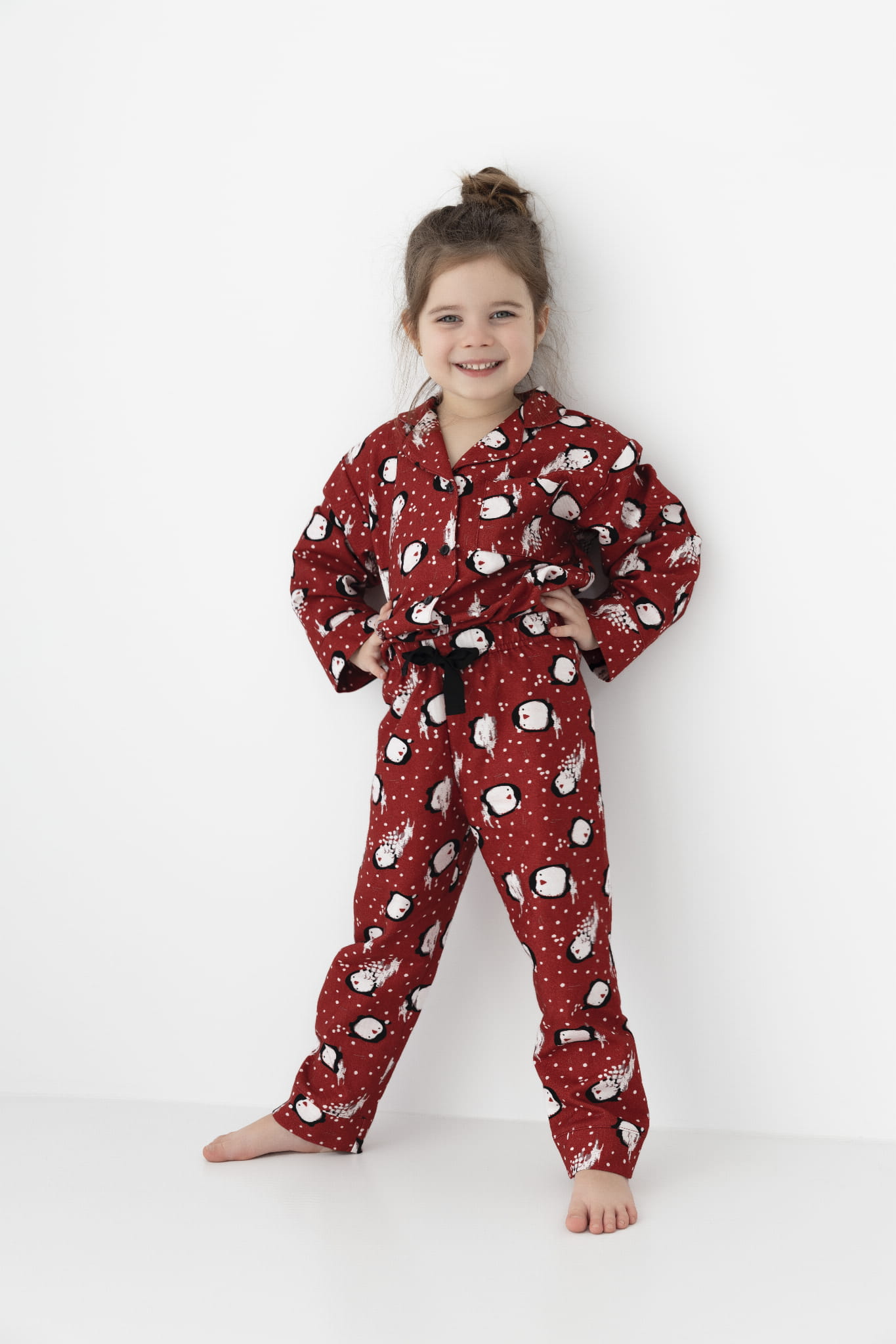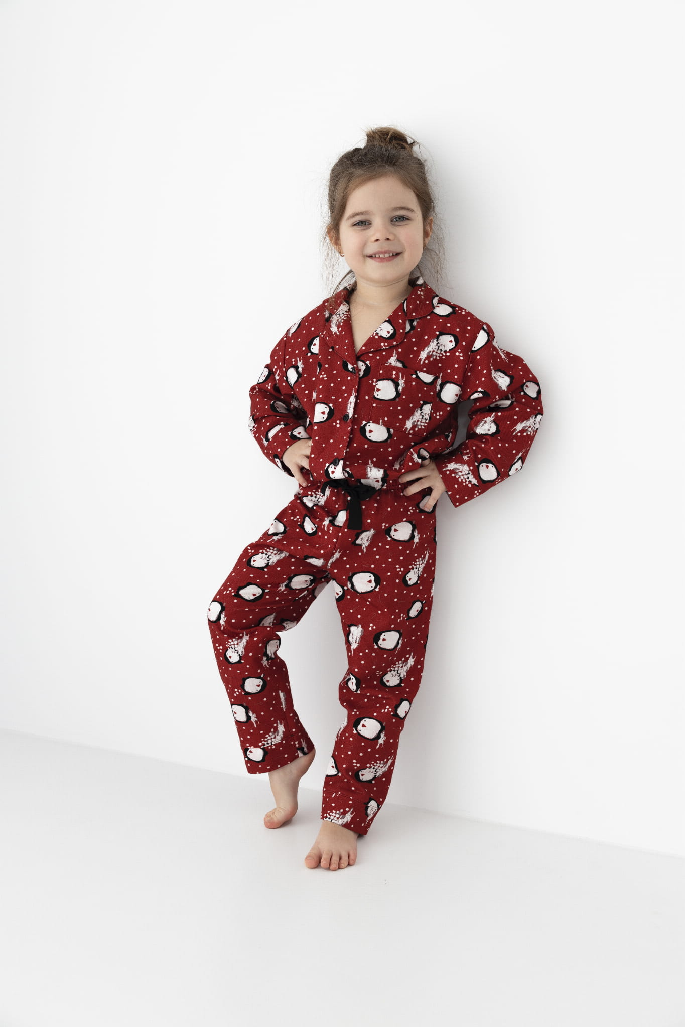 Dziecięca piżama ozdobiona w subtelny wzór. Koszula zapinana na guziki z eleganckim kołnierzyem idealnie łączy komfort i styl, zapewniając wygodę noszenia. Długie, proste spodnie ozdobione troczkiem tworzą spójny, wygodny zestaw, doskonały na każdą noc.