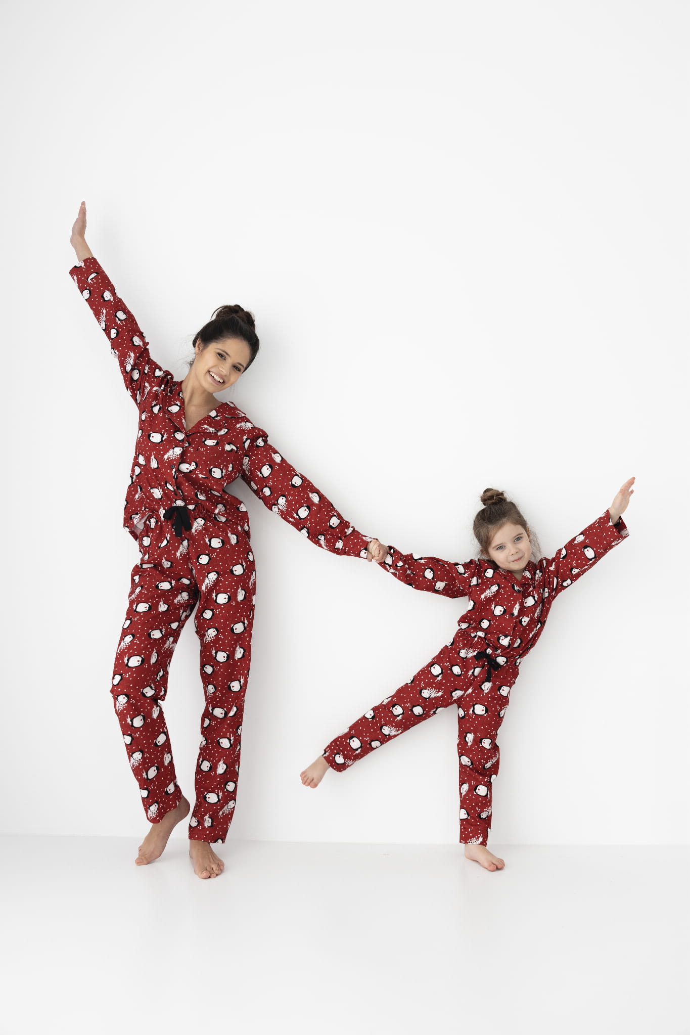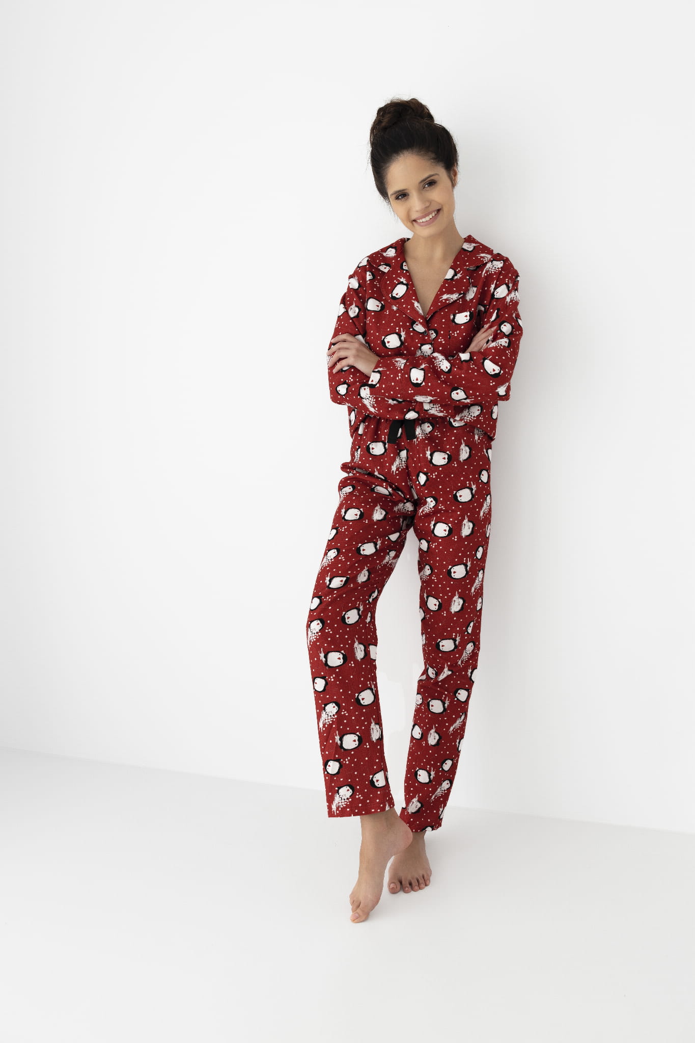 Damska piżama ozdobiona w subtelny wzór. Koszula zapinana na guziki z eleganckim kołnierzyem idealnie łączy komfort i styl, zapewniając wygodę noszenia. Długie, proste spodnie ozdobione troczkiem tworzą spójny, wygodny zestaw, doskonały na każdą noc.