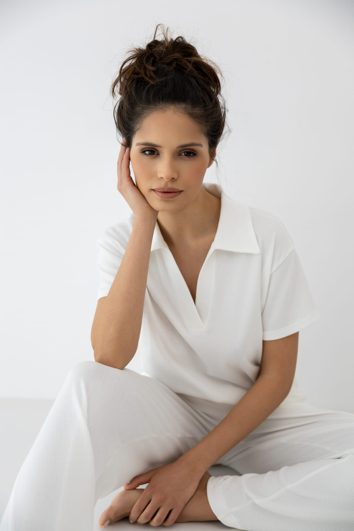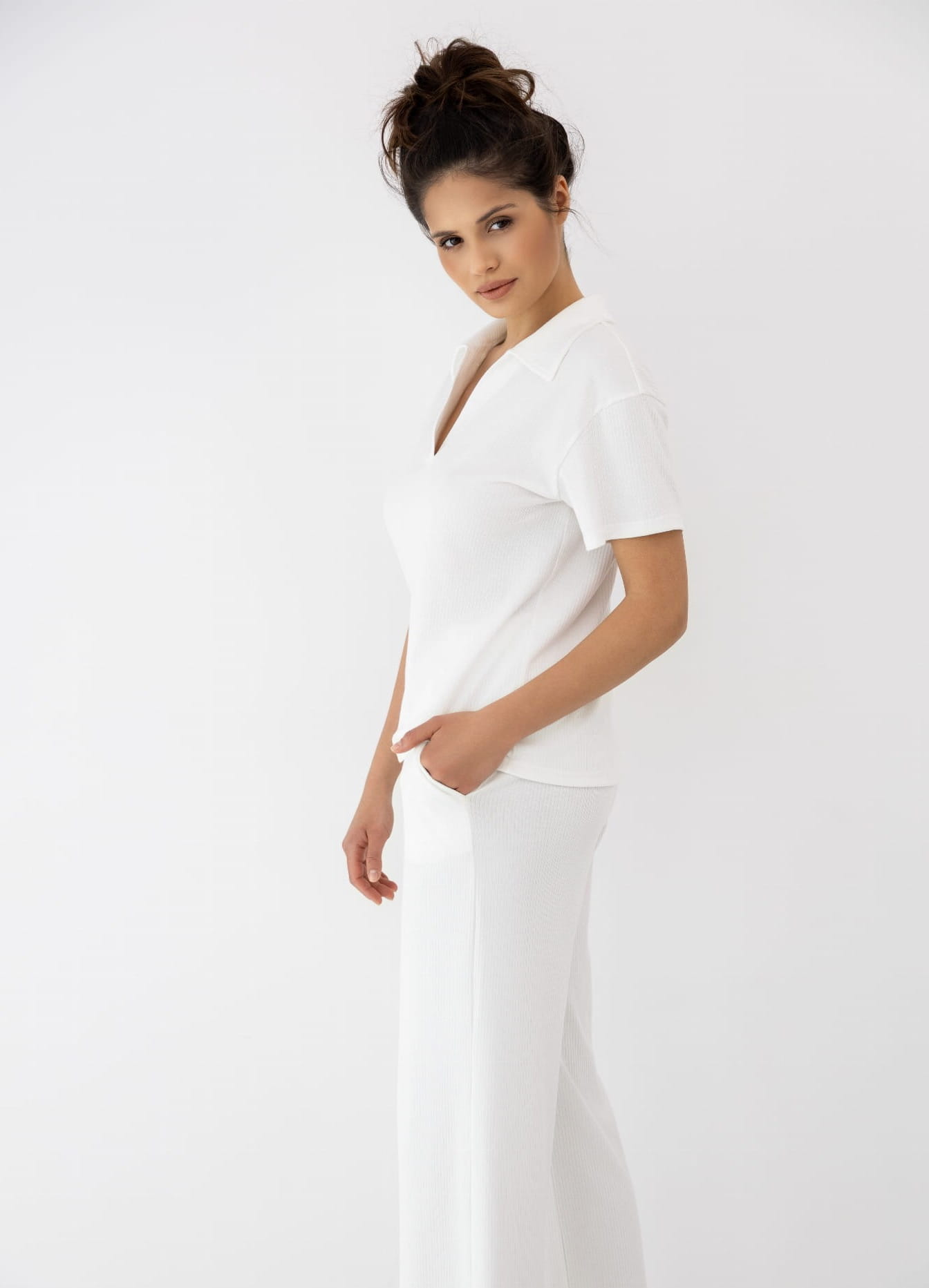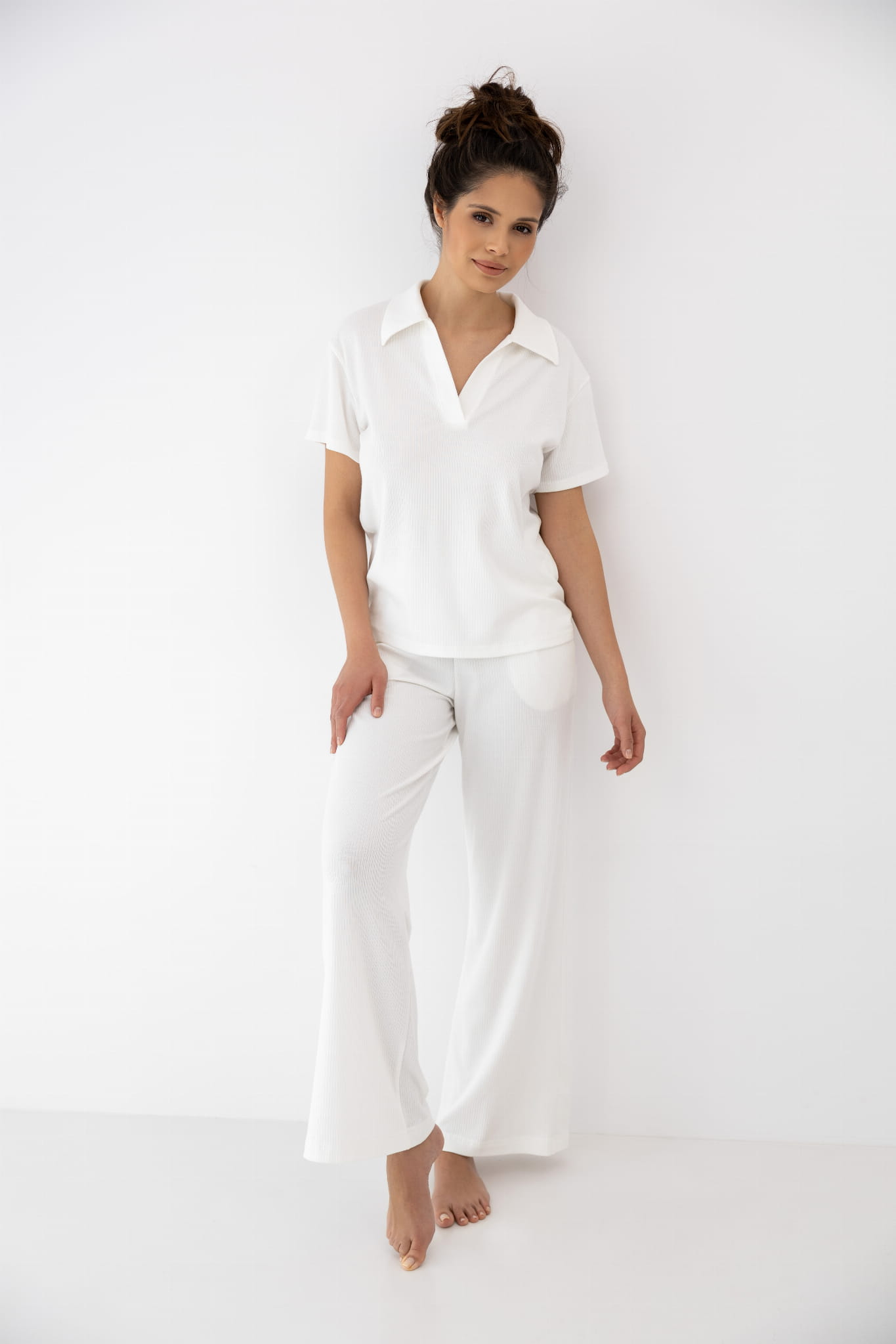 Piżama ZURI to elegancki, dwuczęściowy zestaw składający się z bluzki z krótkim rękawem, kołnierzykiem polo i dekoltem w serek, oraz długich, prostych spodni. Klasyczna forma i neutralna kolorystyka sprawiają, że model doskonale nadaje się na domowy relaks i pełen komfortu sen.