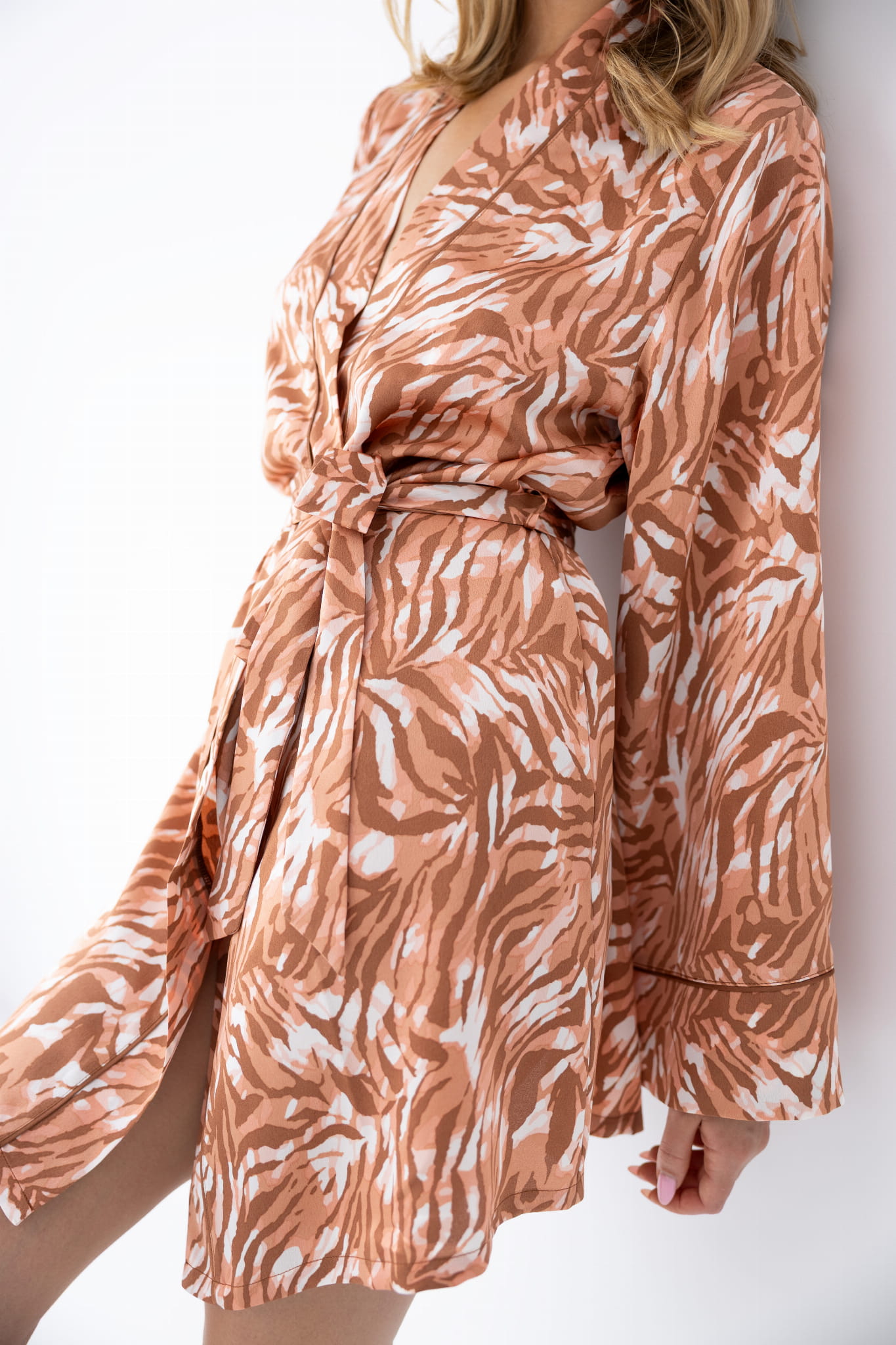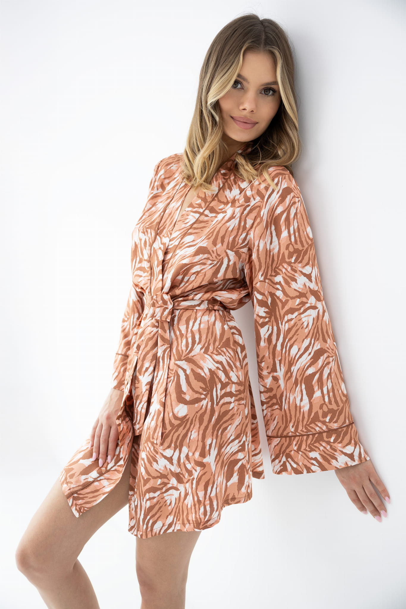 Subtelny, roślinno-zwierzęcy wzór w ciepłej tonacji podkreśla nowoczesny styl, a gładka satynowa tkanina miękko układa się na sylwetce. Idealny zarówno na poranki, jak i wieczorny relaks w domu.